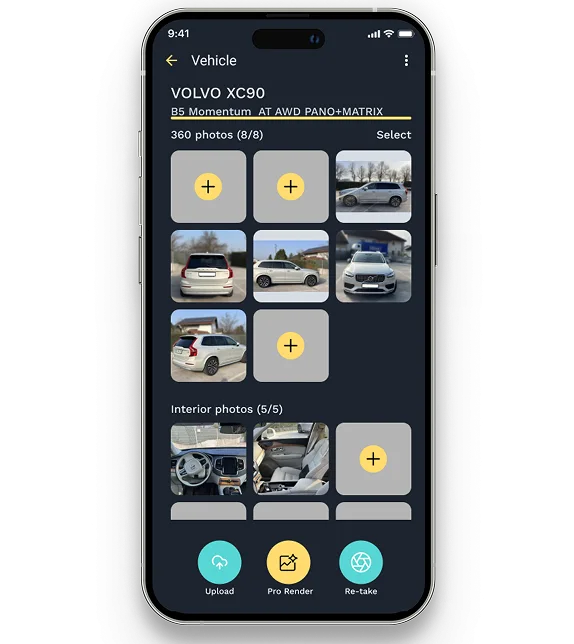 Aplikacija vas vodi korak za korakom pri fotografiranju vozila — od zunanjosti do notranjosti.